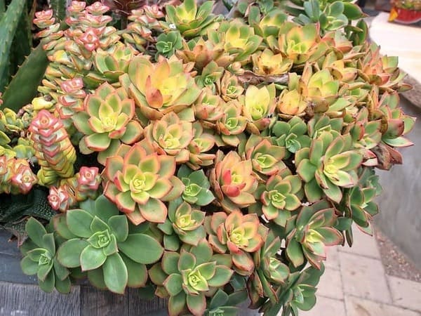 Los Aeoniums pueden regarse cada dos semanas o más en temporada de crecimiento, que comienza en otoño hasta final de la primavera, con riegos profundos y siempre comprobando que el sustrato seque por completo entre ocasiones. En invierno, podemos regar cada mes o más, solo para evitar que el sustrato se reseque en exceso y con el tiempo eso mate a las raíces. Debemos evitar también regar con temperaturas extremas, pues eso dañará nuestra planta, bien por cocción o por congelación de las raíces.